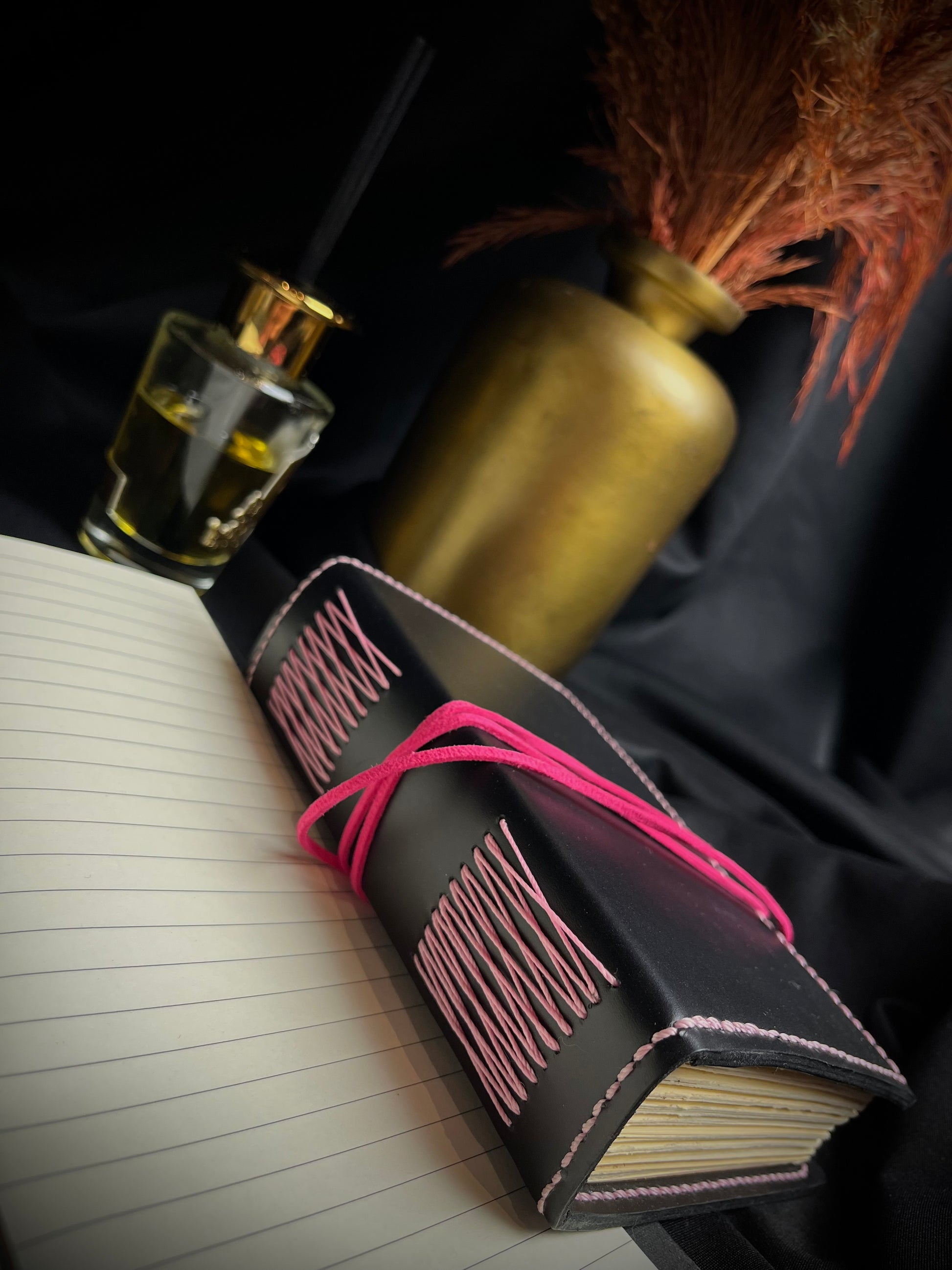 Black leather notebook - with your choice of color. Sturdy leather, stylish and practical - the pages hold securely, and the colorful accent adds uniqueness.