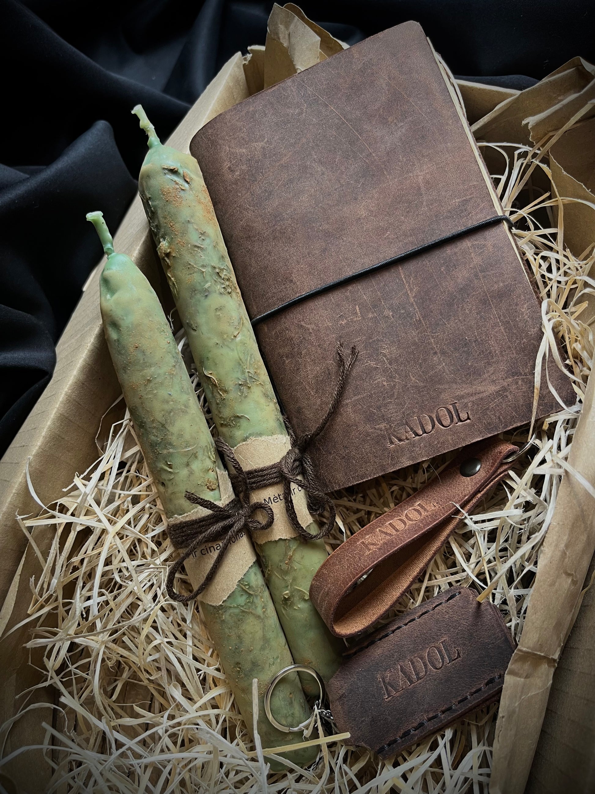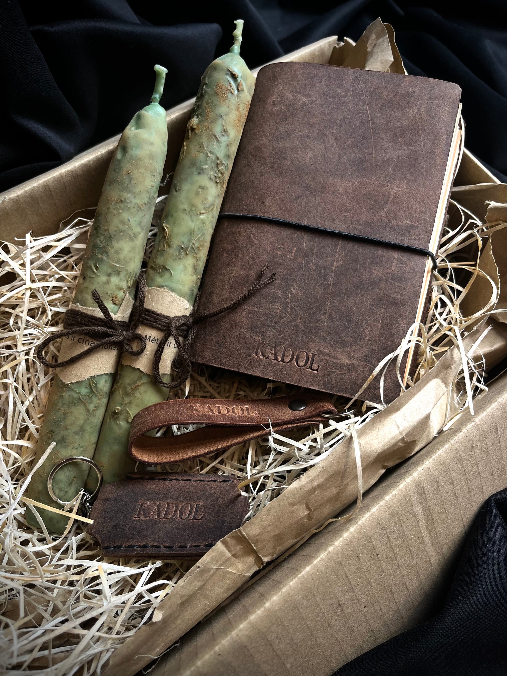 Odinis žiebtuvėlio dėklas, odinis pakabukas, vidutinio dydžio užrašinė ir dvi rankų darbo žvakės – subtilus dizainas ir natūrali medžiagų harmonija, tinkanti bet kokiai progai. 🎁