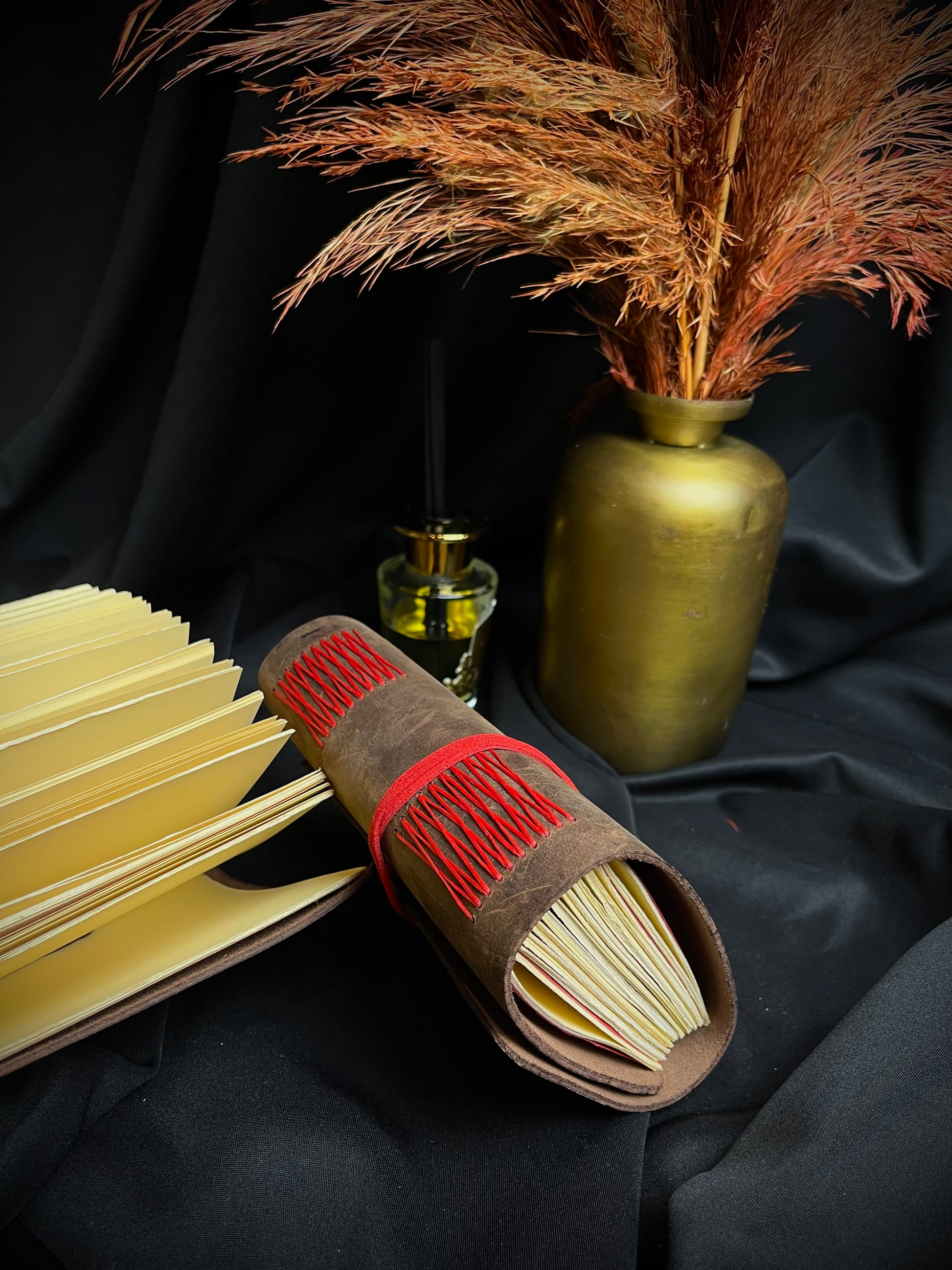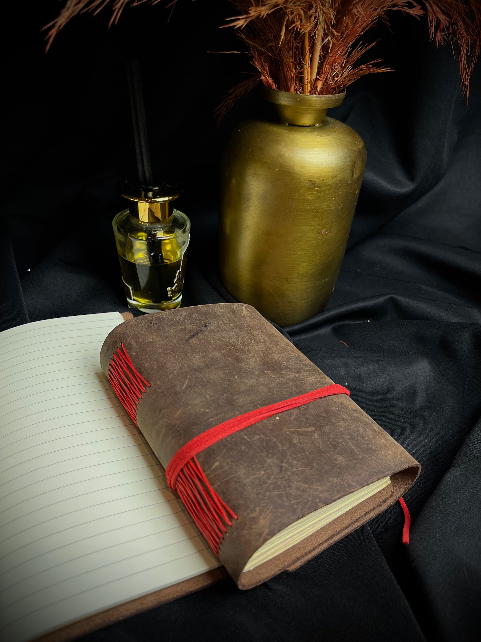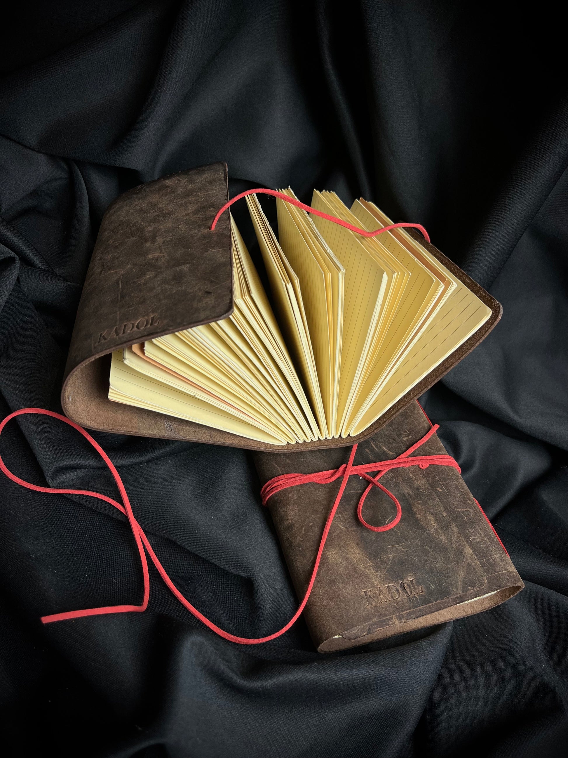 Rūda odinė užrašinė – rankų darbo, iš tvirtos odos. Kompaktiška, praktiška ir stilinga, puikiai tinkanti mintims, planams ar idėjoms užrašyti. Lapai saugiai laikosi, o spalvotas akcentas suteikia individualumo.