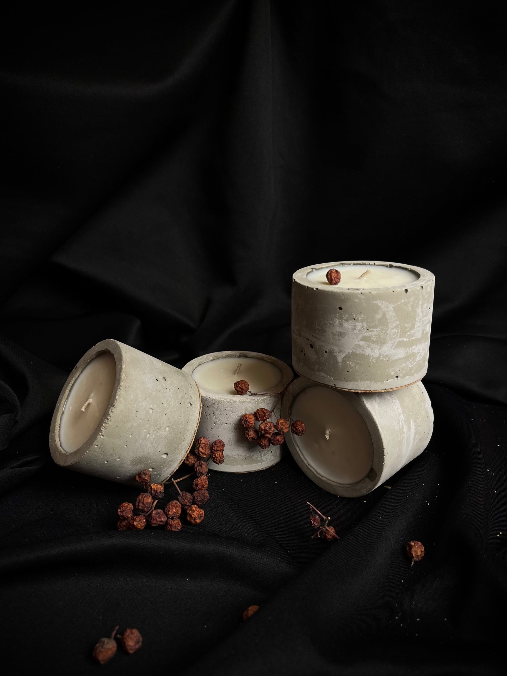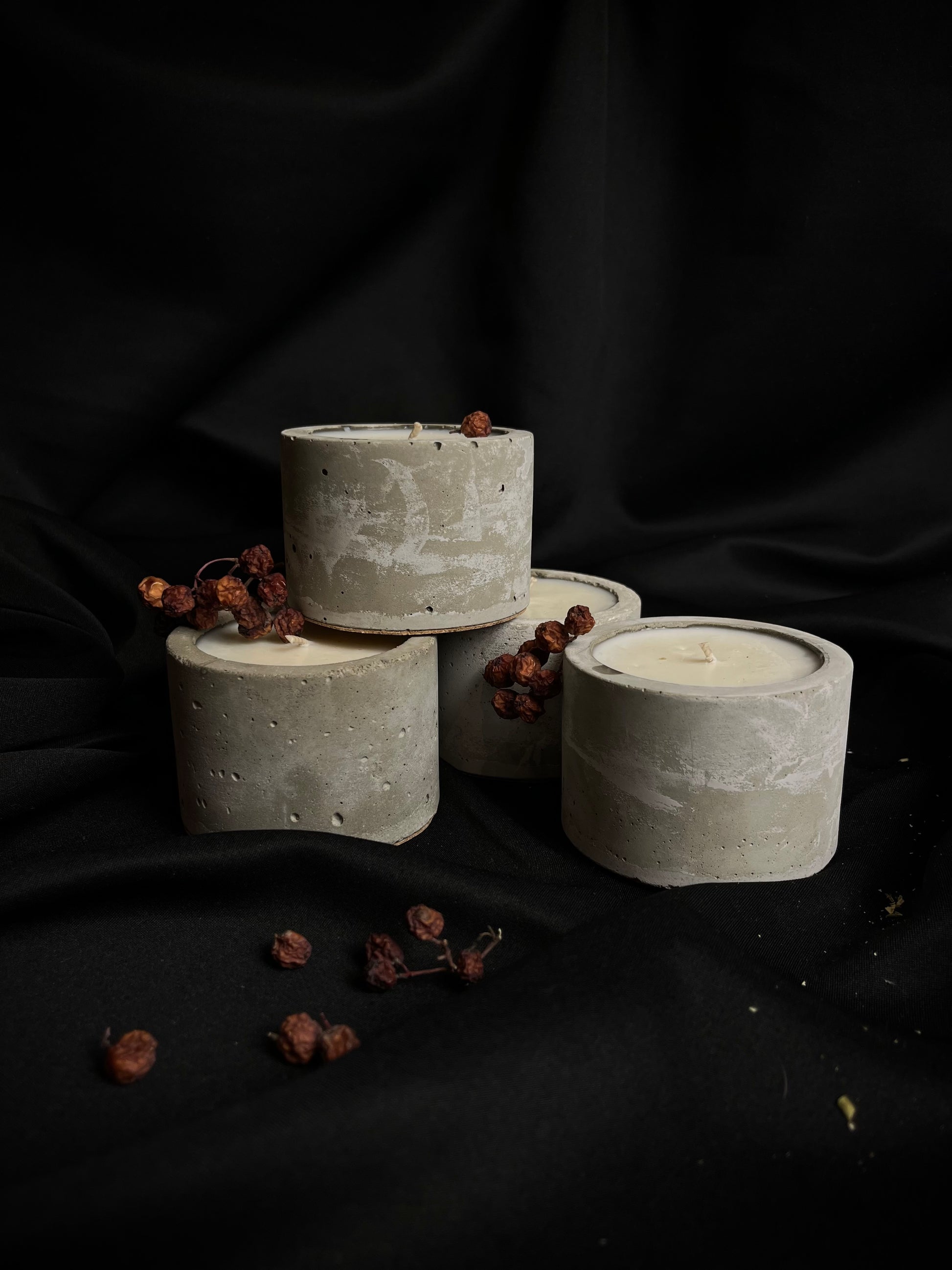 Šilta gintaro ir tamsių medienos natų aura skleidžiasi iš rankų darbo modernios betoninės žvakidės. Uždegus sojų vaško žvakę, įsileisk elegancijos ir paslapčių skleidžiamą magiją.